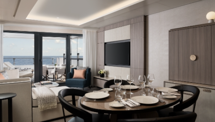 The suite’s terrace and expansive interiors provide a serene, private environment for a relaxing voyage.